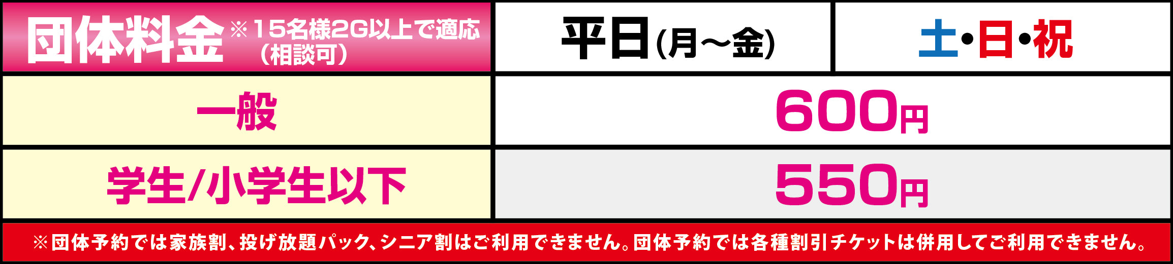 団体料金は15名様以上から適用致します。ご予約のお申し込みは下記メールお問い合わからメールでのお問い合わせお願いします。